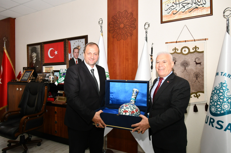 İznik Belediyesi’ni ziyaret eden Bursa Büyükşehir Belediye Başkanı Mustafa Bozbey, İznik Belediye Başkanı Kağan Mehmet Usta ile bir araya geldi. Başkan Usta, Başkan Bozbey’e günün anısına İznik Çinisi vazo takdim etti.
