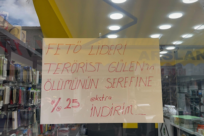 Esnaf Semih Arslan, FETÖ terör örgütü lideri Fethullah Gülen'in ölümü nedeniyle iş yerinde yüzde 25 indirim kampanyası başlattı. İş yerinin camına bir pankart ile bu indirimi duyuran Semih Arslan, "Fethullah Gülen'in ölmesi şerefine indirim yapıyoruz. Halktan yoğun ilgi var, herkesi bekleriz" dedi. İndirim müşterilerin de ilgisini çekti.