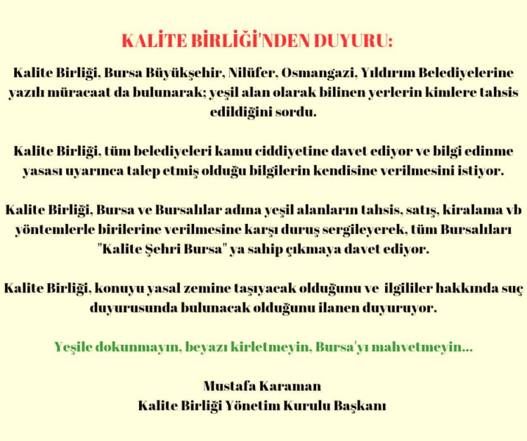 Kalite Birliği, Bursa Büyükşehir Belediyesi ile Nilüfer, Osmangazi ve Yıldırım belediyelerine resmi başvuruda bulunarak “yeşil alan olarak bilinen bölgelerin kimlere, hangi yöntemlerle tahsis edildiğinin” açıklanmasını talep etti.