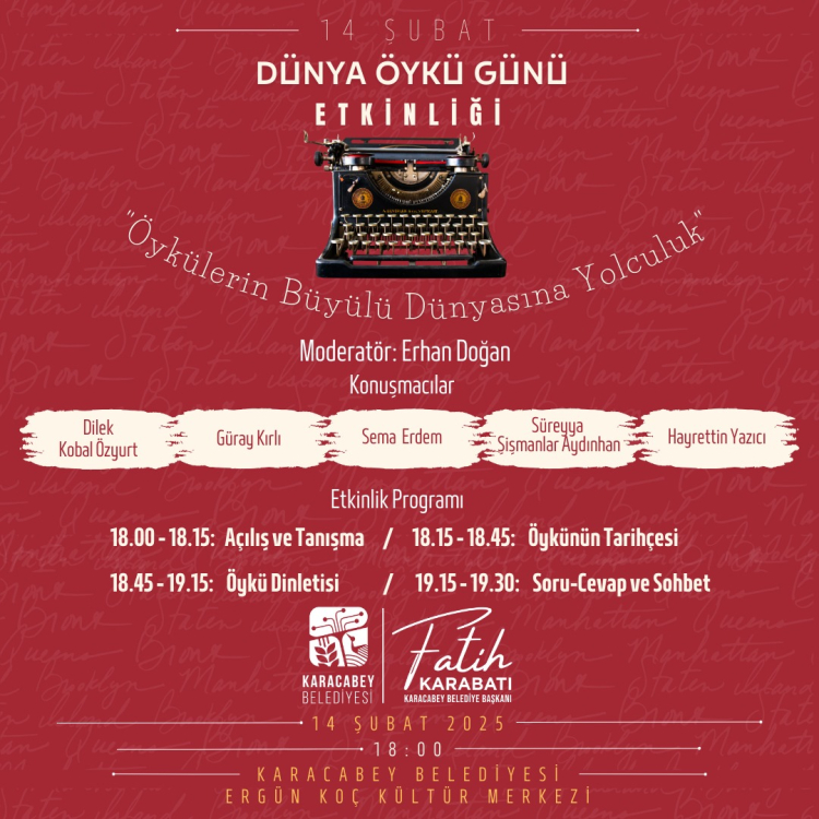 14 Şubat Dünya Öykü Günü etkinliğinde, Belediye Kültür İşleri Müdürü Erhan Doğan'ın moderatörlüğünde Karacabeyli yazar ve sanatçılar; Sema Erdem, Süreyya Şişmanlar Aydınhan, Hayrettin Yazıcı, Galip Duman, Dilek Kobal Özyurt ve Güray Kırlı ile öykülerin büyülü dünyasına yolculuk yapılacak. Dünya Öykü Günü programı Ergün Koç Kültür Merkezi’nde saat 18.00’de başlayacak.