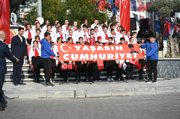Cumhuriyetin kuruluşunun 101. yıldönümü Cumhuriyet Meydanında sabah saat 09.30’da düzenlenen resmi törenle başladı. Cumhuriyet Meydanında düzenlenen resmi törene Karacabey Kaymakamı Hakan Kafkas, Karacabey Belediye Başkanı Fatih Karabatı, Cumhuriyet Başsavcısı Sadullah Gümüş, İlçe Emniyet Müdürü Ümit Şahin, İlçe Milli Eğitim Müdürü Hacı Ongun, Piyade Binbaşı S. Ufuk Arıkan, İlçe Jandarma Komutanı Yüzbaşı Mahir Yağmur ile protokol üyeleri, siyasi parti temsilcileri, STK temsilcisi ve vatandaşlar yoğun ilgi gösterdi. Tören, saygı duruşu ve istiklal marşının okunmasıyla başladı. Kaymakamlık, Belediye Başkanlığı ve Garnizon Komutanlığı çelenklerinin Atatürk Anıtına sunulmasının ardından günün anlam ve önemini anlatan şiir seslendirilirken, İstiklal Ortaokulu öğretmen ve öğrencilerinin hazırlamış olduğu koro ilçe halkına duygu dolu anlar yaşattı. Atatürk ve İstiklal Ortaokulu öğrencilerinin jimnastik gösterisi de izleyenleri büyüledi. Öte yandan Cumhuriyet’in Yeni Yüzyılı konulu okullar arası yarışmalarda dereceye giren öğrencilere ise ödüllerini Başkan Karabatı takdim etti.