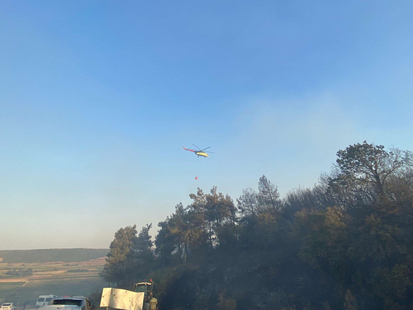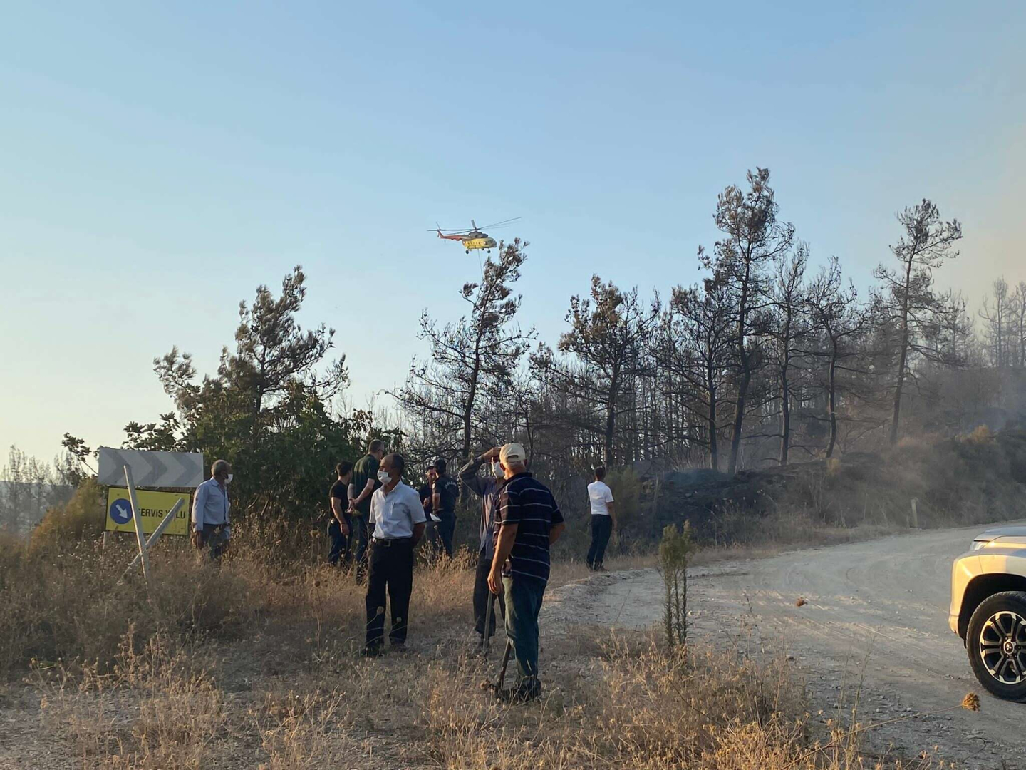Arazöz ve iş makinelerinin de destek verdiği söndürme çalışmalarına helikopter de havadan müdahale etti.