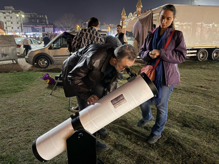 Osmangazili bilim severlerle 8’inci kez bir araya geldiklerini ifade eden Bilim ve Amatör Astronomi Kulübü Yönetim Kurulu Başkanı Cem Özkan, “Bu buluşmamızda, Ramazan ayının anlamıyla özdeşleştireceğimiz Karagöz üzerinden bir tema kurduk. Bir özlemi ifade etmek istiyoruz. Karagöz’ün yaşadığı dönemde Batı’da henüz matbaa keşfedilmemişti ve coğrafi keşifler yapılmamıştı. Ancak o dönemde toplumumuz dünya ölçeğinde en ileride toplumlardan biriydi. Bizler bu etkinlikte halkı bilimle buluştururken bu soruyu düşündürmek istedik. Diyoruz ki keşke Karagöz, bilim insanı olsaydı. Bu temayla bir etkinlik kurguladık. Geleneksel olarak bir Karagöz gösterisi, gerçekleştirdik. Bu gösteride de bilim temalı bir oyun sergiliyoruz. Hayali Tayfun Özeren, sanatçımız bu konuda bize destek oldu. Yaptığımız gözlem ilgili gezegenlerin bilgisini arkadaşlarımız paylaştı. Sunumların ardından bilim meydanı olmasını istediğimiz Osmangazi Meydanı’nda teleskopla vatandaşların katılımıyla gözlem yaptık” dedi.