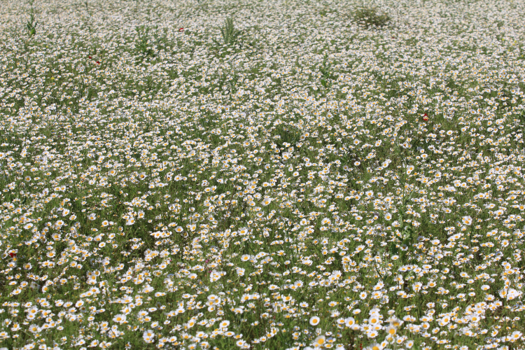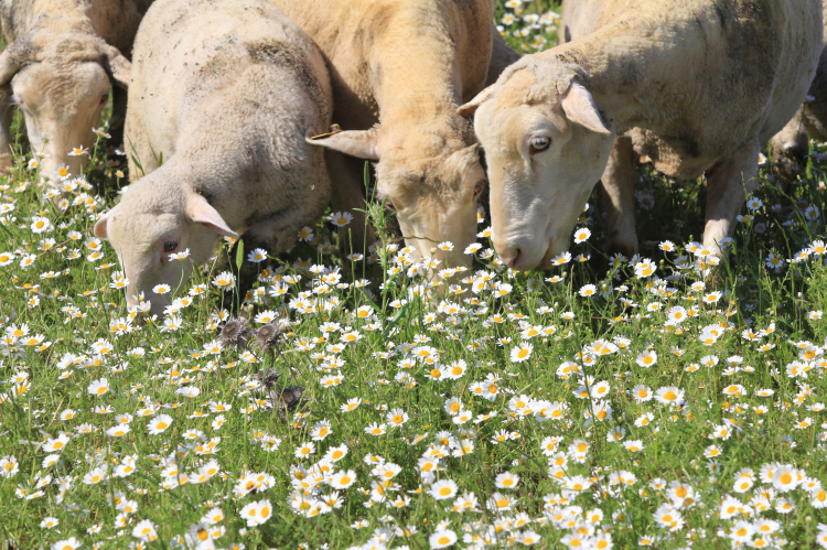 Dönümlerce alanda kendiliğinden yetişen papatyalar, doğanın kendi eliyle şekillenmiş gibi etkileyici bir güzellik sunuyor. Meralara çıkarılan Karacabey merinosu, kıvırcık ve Türktahirova ırkı koyun ve koçlar da kuzularıyla papatya manzarasında otluyor.