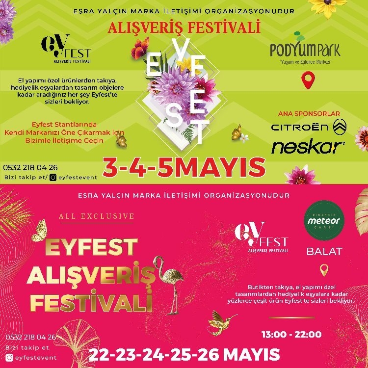 Esra Yalçın Marka İletişim Organizasyonu Eyfest Alışveriş Festivali ilk kez Balat'ta. 22-23-24-25-26 Mayıs 2024 tarihlerinde markanızı büyütmek istiyorsanız Eyfest Alışveriş Festivaline bekleniyorsunuz. Alışveriş, müzik ve eğlenceyi 13.00-22.00 saatleri arasında kaçırmayın.