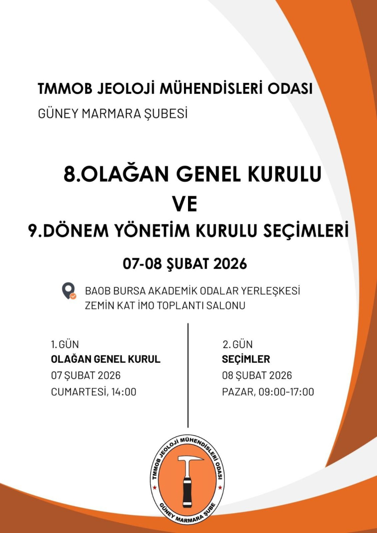 TMMOB Jeoloji Mühendisleri Odası Güney Marmara Şubesi’nin 8. Olağan Genel Kurulu ile 9. Dönem Yönetim Kurulu Seçimleri, 07-08 Şubat 2026 tarihlerinde gerçekleştirilecek. Genel kurul ve seçimler, Bursa Akademik Odalar Birliği (BAOB) Bursa Akademik Odalar Yerleşkesi’nde yapılacak.