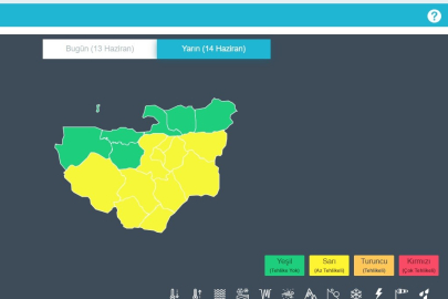 Yarın 12.00'dan başlayıp 22.00'a kadar sürmesi beklenen uyarıda şu ifadelere yer verildi: "Rüzgarın batı ve güneybatı yönlerden kuvvetli ve kısa süreli fırtına şeklinde (50-70 km/saat, kısa süreli 80 km/saat) esmesi beklendiğinden ulaşımda aksamalar, çatı uçması, toz savrulması gibi olumsuzluklara karşı dikkatli ve tedbirli olunmalıdır."