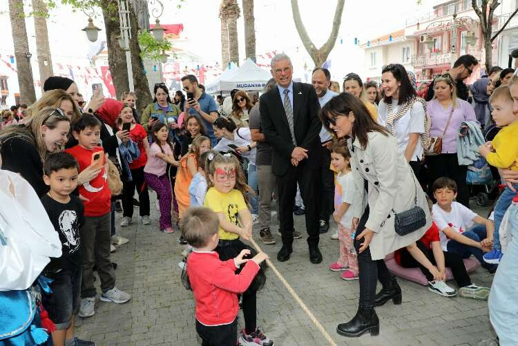 Mudanya’daki törenler, İskele Meydanı’ndaki Atatürk Anıtı’na çelenk sunumuyla başladı. Bayram kutlamaları, Mudanya protokolü ve öğrencilerin İskele Meydanı’ndan Mütareke Meydanı’na yapılan bayram yürüyüşüyle devam etti. Mudanya Belediyesi’nin Mütareke Meydanı’nda düzenlendiği 23 Nisan Çocuk Şenliği’nde çocuklar bayram coşkusunu doyasıya yaşadı. İsmet İnönü Parkı’nda resim, kağıt katlama, sokak oyunları ve yüz boyama atölyelerinde keyifli zaman geçiren çocuklar, gösterileri de ilgiyle izledi.