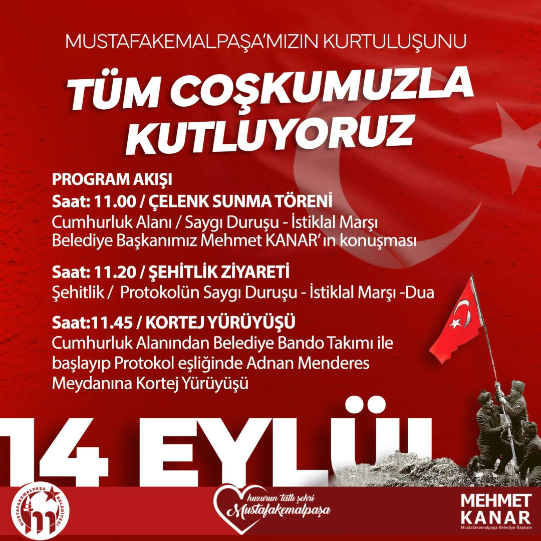Mustafakemalpaşa Belediye Başkanı Mehmet Kanar, "İlçemizin kurtuluş yıl dönümünde ilçe sakinlerimiz ile birlikte bu özel günü coşku ve gururla kutlamak istedik. Mustafakemalpaşa’mızın kıymetli gelenek ve göreneklerini barındıran özel bir etkinlik programı hazırladık. 14 Eylül gününü dolu dolu yaşamak istedik. Kurtuluşun 101. yıl dönümüne doğru ilerlerken, birlik ve dayanışmamızın güçlendiğini görmekten gurur duyuyoruz. 14 Eylül programlarımıza tüm halkımız davetlidir" dedi.