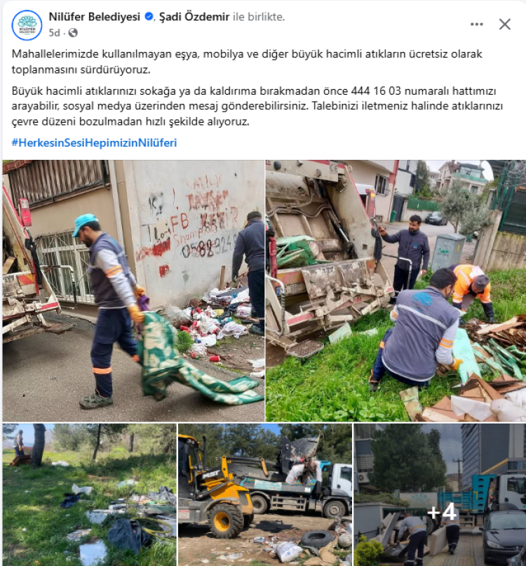 Nilüfer Belediyesi, mahallelerdeki büyük hacimli atıkların kontrolsüz bırakılmasını önlemek için ücretsiz toplama hizmeti sunuyor. Atıklar 444 16 03 veya sosyal medya üzerinden talep edilerek toplanıyor. Amaç, çevre kirliliğini önleyip temiz bir görünüm sağlamak.