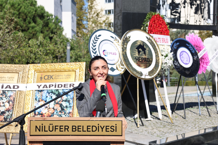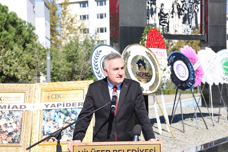 Saygı duruşu ve İstiklal Marşı'nın okunmasının ardından konuşan Nilüfer Belediye Başkanı Şadi Özdemir, “Bugün, bir milletin küllerinden yeniden doğduğu, özgürlüğü, eşitliği ve adaleti temel alan yeni bir yaşamı kurduğu büyük günün yıl dönümündeyiz” dedi.