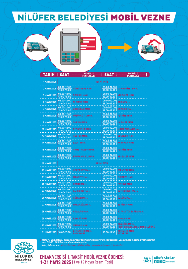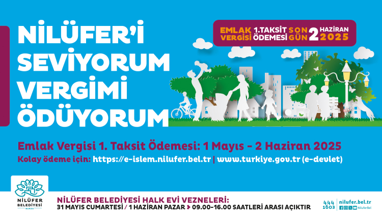 Nilüferliler, 1 Mayıs ile 2 Haziran arasında emlak vergilerinin ilk taksitini belediyedeki veznelerin yanı sıra, mobil vezne, internet üzerinden, PTT ve belirli bankalar aracılığıyla ödemelerini yapabilecek.