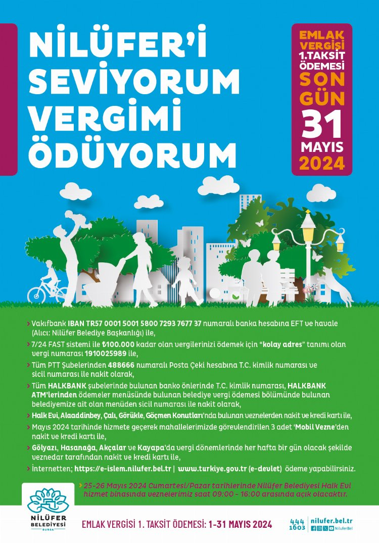 Nilüfer Belediyesi vatandaşların vergilerini kolayca ödeyebilmeleri için birçok uygulamayı hizmete sunuyor. 1-31 Mayıs arası devam edecek birinci taksit ödemelerini yapmak isteyen vatandaşlar Nilüfer Belediyesi Halk Evi, Alaaddinbey, Çalı, Görükle ve Göçmen Konutları’ndaki veznelerden ödemelerini yapabilecek. Gölyazı, Hasanağa, Akçalar ve Kayapa gibi şehir merkezine uzak mahallerde de vergi ödemek isteyenler, mobil veznelerde nakit veya kredi kartı ile ödemelerini yapabilecek. İsteyen vatandaşlar ise Nilüfer Belediyesi’nin www.e-islem.net.nilufer.bel.tr / www.türkiye.gov.tr internet adresi üzerinden de vergi borcu sorgulama ve kredi kartıyla ödeme seçeneklerini kullanarak, vergilerini kolaylıkla internet aracılığıyla ödeyebilecekler.