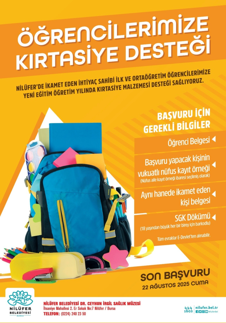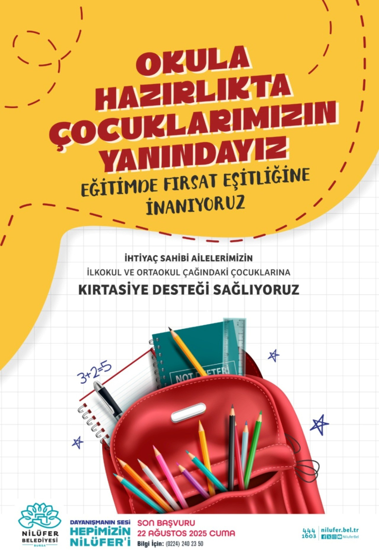 Nilüfer Belediyesi, 2025-2026 eğitim öğretim yılı öncesinde ihtiyaç sahibi ailelerin ilk ve ortaöğretimdeki çocukları için kırtasiye malzemesi desteği sağlayacak. Başvurular 22 Ağustos Cuma günü son bulacak.