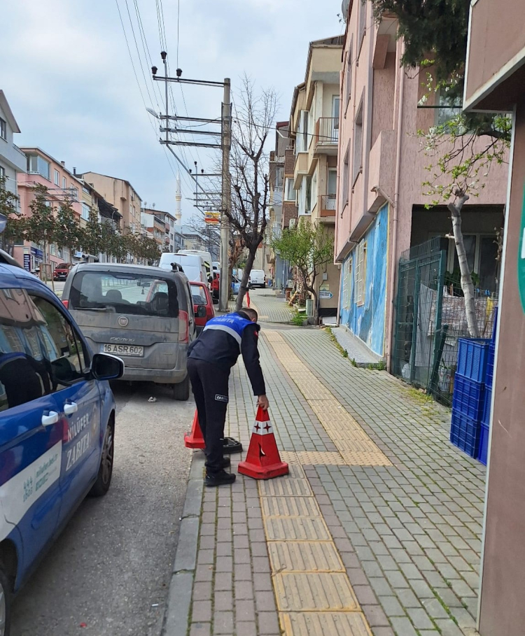 Nilüfer Belediyesi zabıtası, Görükle, Beşevler, 29 Ekim Mahallelerinde yaya geçişini engelleyen dubaları, bayrakları topladı. Özlüce, Uğur Mumcu, Atatürk Cd. gibi bölgelerde denetim yapıldı. Vatandaş güvenliği ön planda.