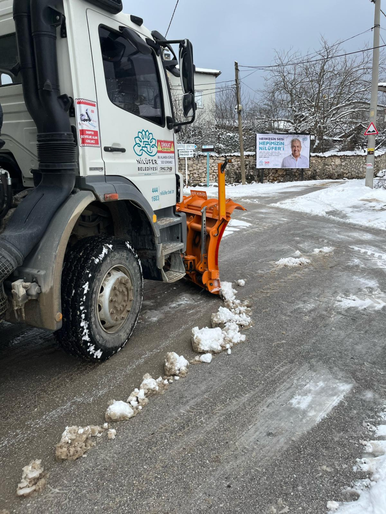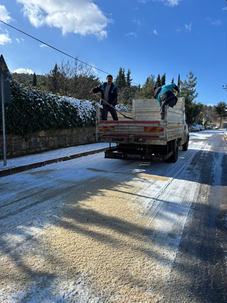 Nilüfer Belediyesi ekipleri, kar yağışı ve soğuk hava nedeniyle ilçe merkezinde ve kırsal mahallelerde buzlanan yolları açmak için seferber oldu.