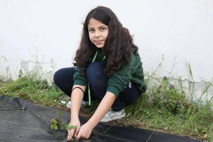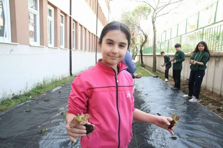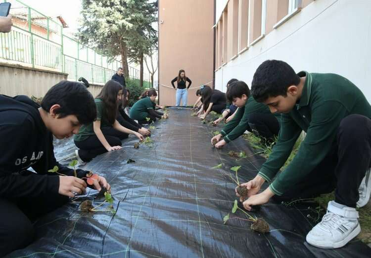 Zekai Gümüşdiş Ortaokulu öğrencileri, Nilüfer Belediyesi tarafından getirilen çilek ve marul fidelerini toprakla buluşturdu.