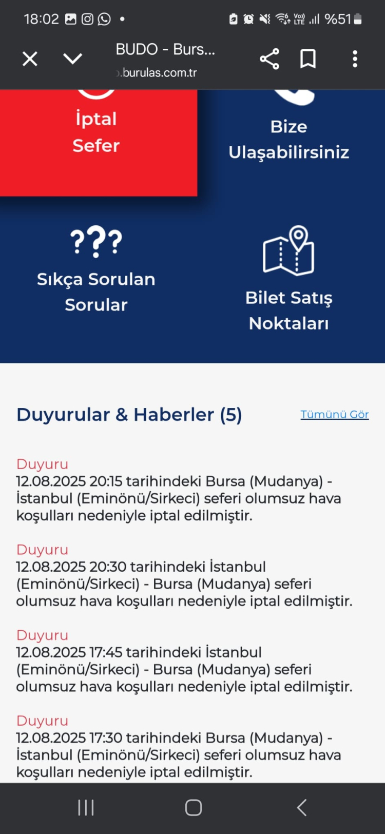 Bursa Deniz Otobüslerinin internet sitesindeki duyuruya göre, bugün saat 17.30'da gerçekleştirilmesi planlanan Bursa (Mudanya) ve İstanbul (Eminönü/Sirkeci) seferi ile 17.45'te planlanan İstanbul (Eminönü/Sirkeci) ve Bursa (Mudanya) seferleri olumsuz hava koşulları nedeniyle iptal edildi.