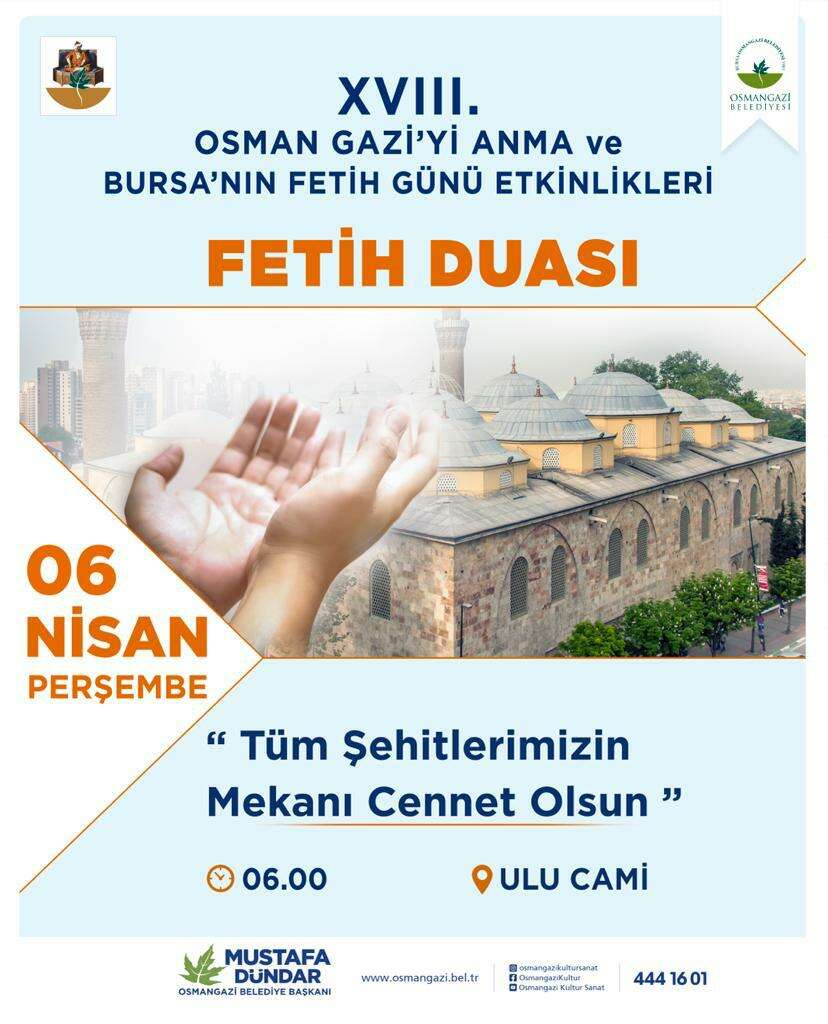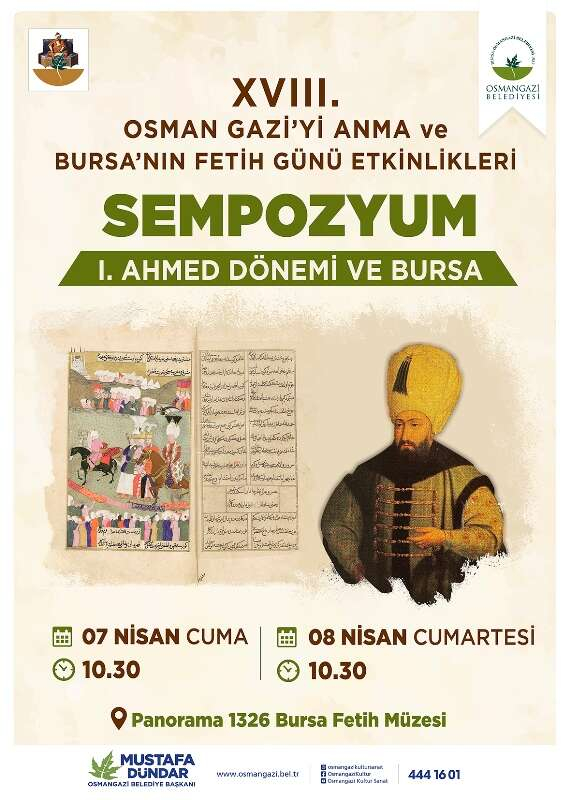 Osmangazi Belediyesi, beylikten cihan devletine uzanan şanlı yolculuğun ilk kapısı olan Bursa’nın fethinin 697’nci yıl dönümü dolayısıyla çeşitli etkinliklere ev sahipliği yapacak. Bu yıl 18’ncisi gerçekleştirilecek etkinlikler kapsamında ilk olarak 6 Nisan Perşembe günü saat 06.00’da Ulu Cami’de fetih duası yapılacak. 7 Nisan Cuma günü saat 10.30’da Panorama 1326 Bursa Fetih Müzesi’nde başlayacak ‘Sultan I. Ahmed Dönemi ve Bursa’ sempozyumu, 8 Nisan Cumartesi günü ikinci oturumla son bulacak.