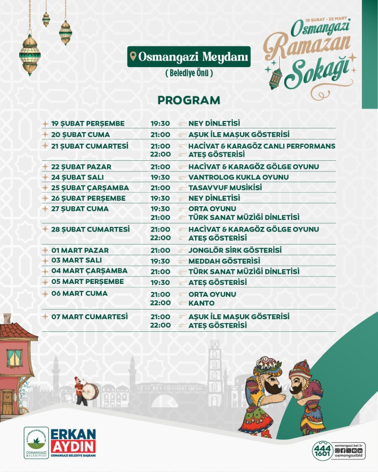 Osmangazi Ramazan Sokağı, birlik, beraberlik ve paylaşma duygularının en güzel şekilde yaşanacağı adreslerden biri olacak. Geleneksel sanatlar, sahne gösterileri, tasavvuf musikisi akşamı ve çocuklara özel etkinliklerle Osmangazi’de Ramazan akşamları adeta bir şenlik havasında geçecek. Program kapsamında Karagöz ve Hacivat gölge oyunları, canlı performanslar, meddah gösterileri, orta oyunları, vantrolog kukla oyunları, Aşuk ile Maşuk gösterileri izleyiciyle buluşacak. Ateş ve jonglör sirk gösterileri ise Ramazan gecelerine görsel bir şölen sunacak.