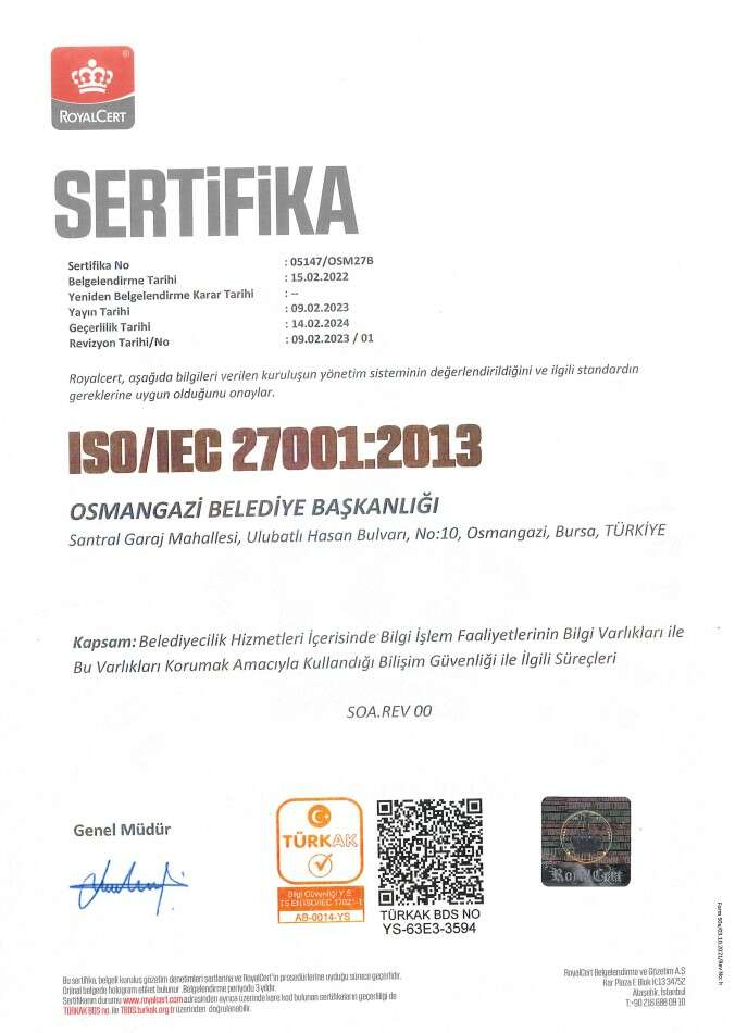 Osmangazi Belediyesi, kurumsal bilgi güvenliğinin sağlanmasına dair süreç ve bilgi sistemlerini içine alan ISO 27001:2013 Bilgi Güvenliği Yönetim Sistemi belgesini yenileyerek başarılarını kurumsal anlamda taçlandırdı.Bilgi İşlem Müdürlüğü’nün koordinasyonunda yürütülen çalışmalarda Mali Hizmetler, İnsan Kaynakları ve Destek Hizmetleri Müdürlüklerinin bilgi güvenliği süreçleri yeniden yapılandırıldı.