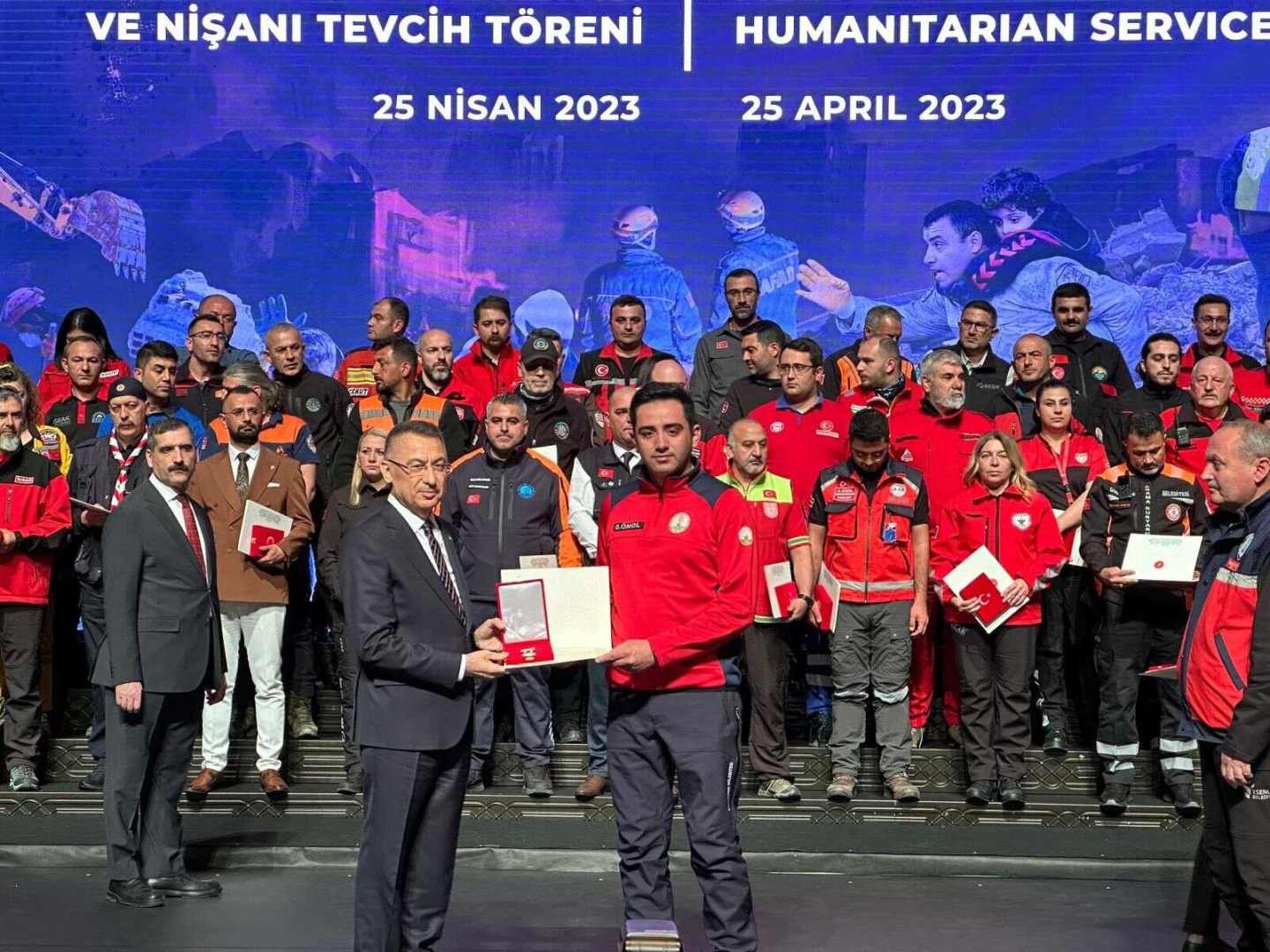 Kahramanmaraş ve Hatay merkezli depremlerde fedakârlık gösteren yerli ve yabancı arama kurtarma ekiplerine teşekkür eden Cumhurbaşkanı Erdoğan, “Takdir ve taltifin asıl büyüğü, sizlerin depremzedelerimiz başta olmak üzere, 85 milyonun gönlünde edindiğiniz müstesna yerdir. Her biriniz, sergilediğiniz olağanüstü fedakârlıkla adınızı tarihe yazdırdınız. İnanç, köken, dil, kültür farklılıklarına rağmen acımızın ortak olduğunu bir kez daha gösterdiniz. Ayaza, soğuğa, yağmura ve pek çok imkânsızlığa meydan okuyarak, asrın felaketiyle mücadelemizin sembolleri hâline geldiniz. Kendi hayatınızı tehlikeye atma pahasına, enkazdan çıkardığınız her canla sayısız ana gözyaşları içinde şahitlik etmemizi sağladınız” dedi. Cumhurbaşkanı Erdoğan’ın konuşmasının ardından madalya ve berat takdim törenine geçildi. Deprem bölgelerinde arama kurtarma faaliyeti yapan 218'i Türk, 116'sı yabancı 334 kişi Devlet Üstün Fedakârlık Madalyası ve Nişanı tevcihine layık görüldü.