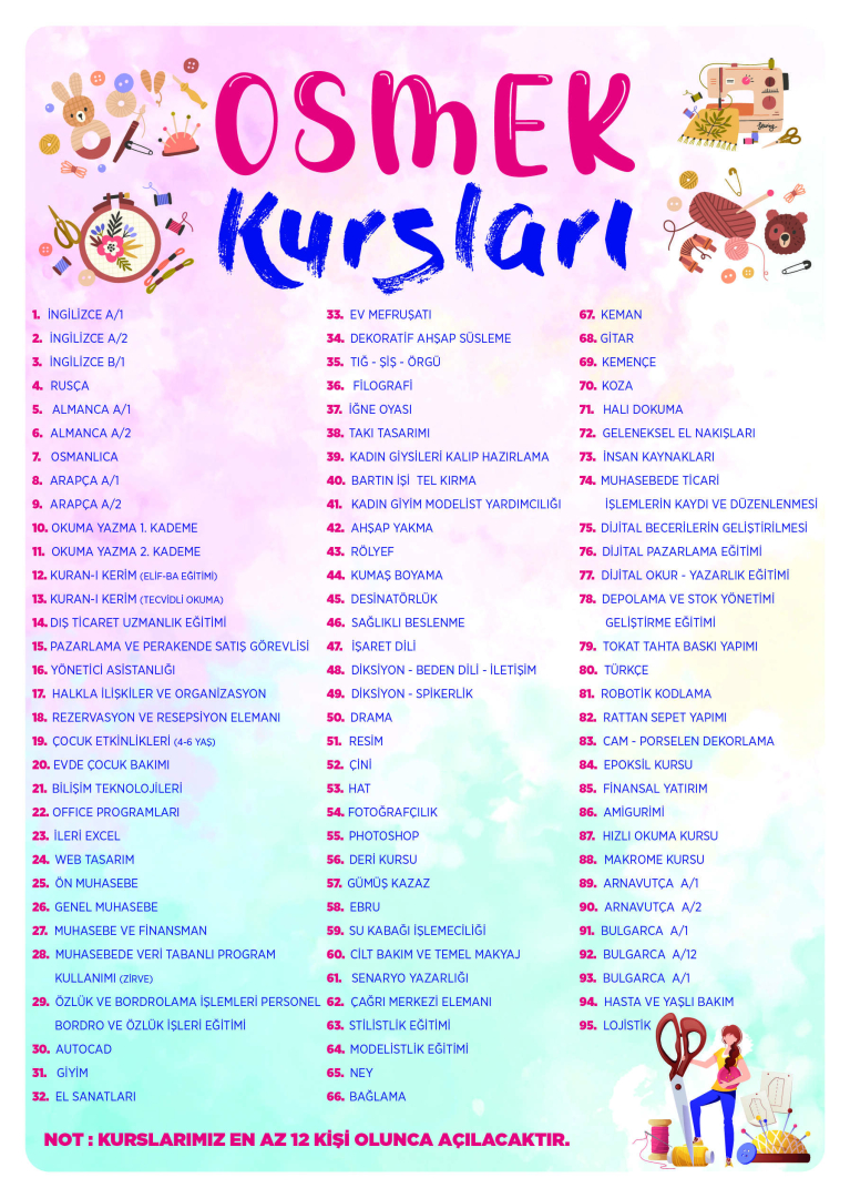 Vatandaşlara hem mesleki eğitim hem de sosyal aktivite sunmak amacıyla ücretsiz olarak düzenlenen kurslar; bu yıl Soğanlı, Emek Yakup Aktaş, Hüdavendigar, Ördekli, Seyyid Usul, Haraççıoğlu, Demirtaş, Namık Kemal, Bağlarbaşı, Panayır, Pınarbaşı, Dobruca, Altınova, Yeniceabat, Tuna, Hamitler, Mehmet Akif, Çeltik, Kükürtlü, Elmasbahçeler, Emek FSM ile Emek Adnan Menderes Mahallesi’ndeki 23 farklı merkezde gerçekleştirilecek. Eğitimlerde başarı gösteren kursiyerlere kurs bitiminde Milli Eğitim Bakanlığı onaylı sertifika takdim edilecek.
