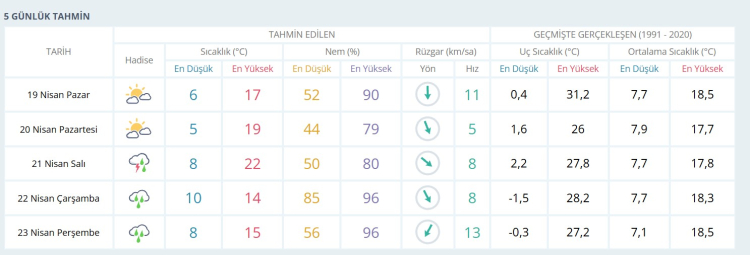 22 Nisan Çarşamba: Yağışla birlikte sıcaklık bir anda 14°C'ye kadar gerileyecek. Nem oranının %96'lara çıkacağı bu günde, yağışların gün boyu etkili olması bekleniyor.
