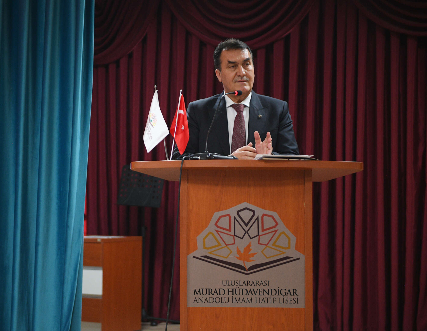 Dünyanın 82 farklı ülkesinden öğrencinin eğitim öğretim gördüğü Uluslararası Murad Hüdavendigar Anadolu İmam Hatip Lisesi Konferans Salonu’nda düzenlenen karne dağıtım töreninde konuşan Başkan Mustafa Dündar, dünyanın farklı ülkelerinden gelip başarılı bir eğitim alan öğrencilerin, ülkeleri ile Türkiye arasında birer gönül elçisi olduğunu belirtti. Konuşmasında, eğitim ve öğretim kadar, iyi bir insan olmanın da büyük bir önem taşıdığına vurgu yapan Dündar, “Bu yıl eğitim öğretim dönemi açılışında gittiğim okullarda yaşanan diyaloglardan birini burada da paylaşmak istiyorum. Sizler için böyle güzel bir okulda okumak, başarılı olmak ve diploma almak bir başarı mıdır? Elbette ki başarıdır. Ancak, bu başarının yanında bir de ‘adam’ olmak var. Okuyup başarılı birer mühendis, öğretmen, doktor olabilirsiniz. Ancak, burada eğitimin yanında iyi birer insan olarak, yani ‘adam’ olarak yetişmek de çok önemli. Burada, iyi bir eğitim ile mühendis, doktor ve öğretmen olan insanlar yetiştiriyoruz. Her birinizden, kendi yolunuzu aydınlattığınız gibi gittiğiniz yerlerde çevrenizi de aydınlatmanızı istiyoruz. Bir proje okulu olan Uluslararası Murad Hüdavendigar Anadolu İmam Hatip Lisesi’nde öğrenciler bu düsturla yetişiyor” diye konuştu.