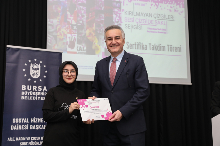 Bursa Büyükşehir Belediyesi'nin 'Kırılmayan Çizgiler' sergisine katılan öğrencilere sertifika verildi. Sergi, kadına şiddetle mücadele ve eşitlik mesajı taşıyan 110 eserden oluşuyor. Başkanvekili Gazioğlu, gençlerin katkısını vurguladı.