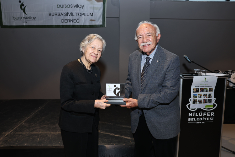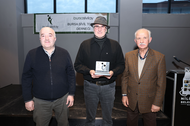 Bursa tarihine dair yazıları, belgeselleri ve kitapları ile Bursa’nın hafızasını oluşturup, kentin belleğini yaşattığı için ödüle layık görülen İsmail Kemankaş’a ödülünü Sivilay Yönetim Kurulu Üyesi Binay Kazan takdim etti.