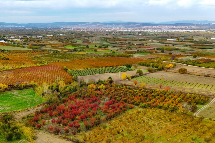 Bursa’nın İnegöl ilçesinde yer alan meyve bahçeleri, sonbaharın tüm renklerini gözler önüne sererken, bölgeye gelen ziyaretçiler için eşsiz bir manzara sunuyor.