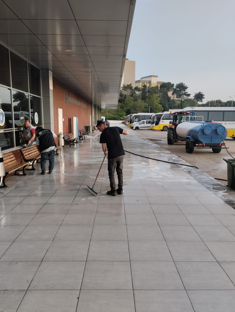 Temizlik çalışmaları kapsamında terminaldeki kirli ve kötü kokulara neden olabilecek alanlar dezenfekte edildi; zemindeki lekeler, toz ve atıklar basınçlı suyla temizlendi. Ayrıca, çevredeki çöp kutuları ve bekleme alanları da hijyenik hale getirildi.