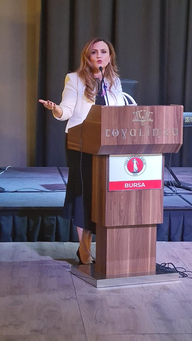 Gecenin en anlamlı anları, TKB Bursa’nın Hatay’da hayata geçireceği yeni projenin sorumlusu olan Hataylı depremzede Endüstri Mühendisi Özge Çakır’ın kürsüye gelmesiyle yaşandı. Hataylı kadınların selamını Bursa’ya getiren Çakır; "Bahur, zahter ve defne kokusunu, baharın umudunu getirdim" sözleriyle salonu derin bir sessizliğe sevk etti. Bir şehri binaların değil, bilinçli insanların ve güçlü kadınların ayağa kaldıracağını vurgulayan Çakır’ın konuşması, katılımcılar tarafından ayakta alkışlandı.