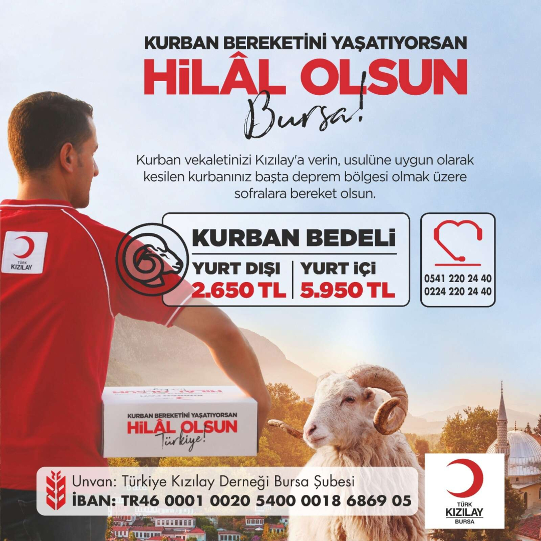 Hayırseverlerin desteği ile bu yıl 155’inci yaşını kutlayan Türk Kızılay, vekaletle kurban kesim kampanyasını başlattı. Yurt içi ve yurt dışı olmak üzere farklı coğrafyalarda kurban bereketini yaşatan Türk Kızılay Bursa İl Merkezi, bu yıl, "Kurban Bereketini Yıl Boyu Yaşatıyorsan Hilal Olsun Bursa" sloganıyla kurban vekalet bedellerini açıkladı. Kurban hisse bedelini yurt içi 5 bin 950 lira, yurt dışı 2 bin 650 lira olarak belirlenirken, bu yıl bağışların büyük bir bölümü Kahramanmaraş merkezli depremden etkilenen afetzedelere ulaştırılacak.