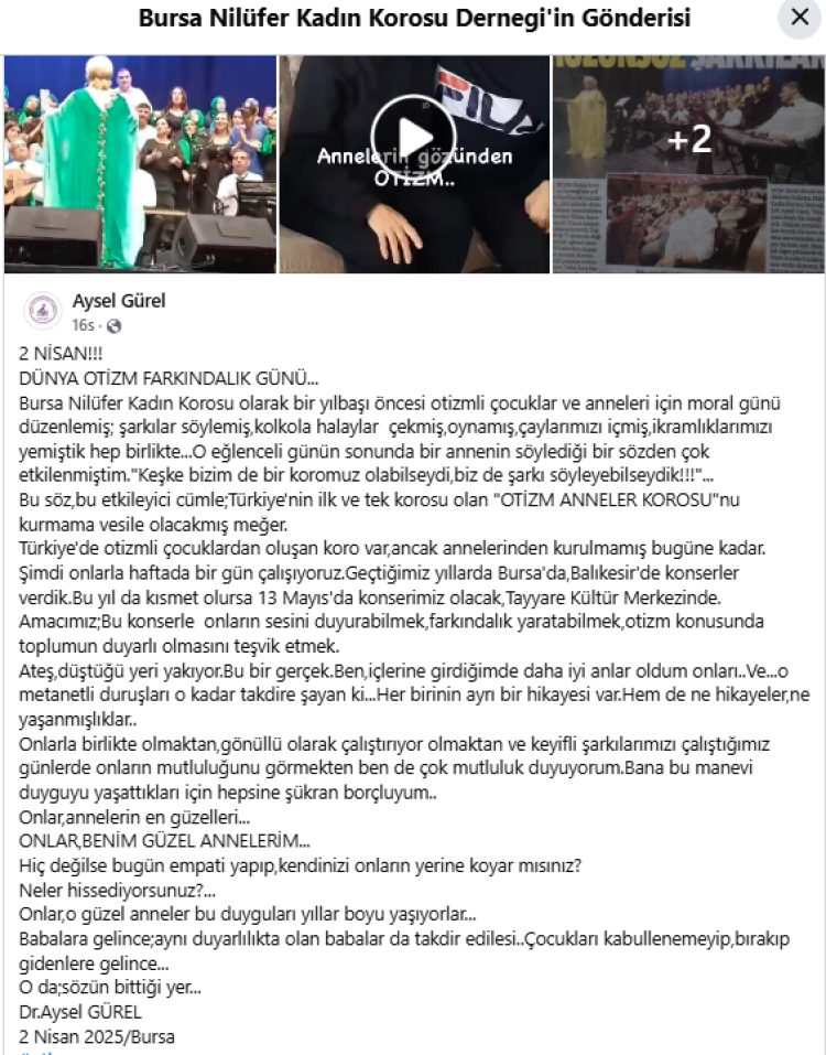 Bursa Nilüfer Kadın Korosu Derneği Başkanı Dr. Aysel Gürel, 2 Nisan Dünya Otizm Farkındalık Günü kapsamında yaptığı açıklamada, otizmli çocuklar ve anneleri için düzenledikleri moral gününün ardından Türkiye'nin ilk ve tek "Otizm Anneler Korosu"nu kurduklarını belirtti.