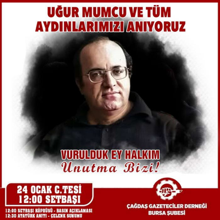 Araştırmacı Gazeteci-Yazar Uğur Mumcu, 33. ölüm yıldönümünde Bursa'da anılıyor. Çağdaş Gazeteciler Derneği (ÇGD) Bursa Şubesi öncülüğünde gerçekleştirilecek anma etkinliği 24 Ocak'ta Setbaşı Köprüsü'nde yapılacak basın açıklamasıyla başlayacak, sergi ve panelle devam edecek.
