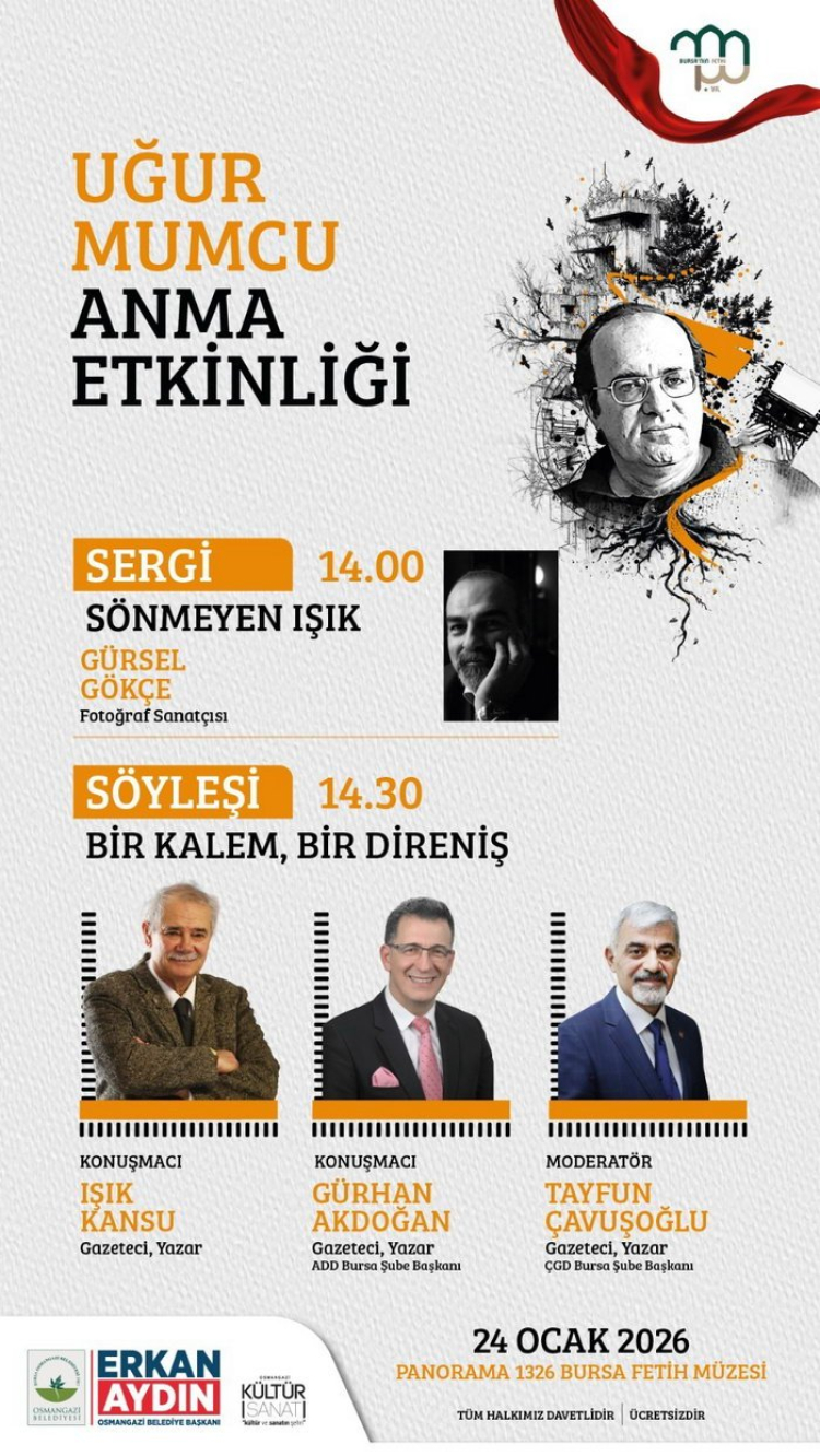 Etkinlikler, Osmangazi Belediyesi’nin ev sahipliğinde saat 14.00’te Panorama 1326 Bursa Fetih Müzesi’nde devam edecek. Program kapsamında gazeteci ve fotoğraf sanatçısı Gürsel Gökçe’nin imzasını taşıyan “Sönmeyen Işık Uğur Mumcu” adlı fotoğraf sergisi açılacak. Sergide, Uğur Mumcu’nun cenaze töreni ve sonrasında Türkiye’nin dört bir yanında düzenlenen anma etkinliklerinde çekilen fotoğraflardan oluşan özel bir seçki yer alacak. Bugüne kadar 100’ün üzerinde farklı noktada açılan sergi, her yıl güncellenen fotoğraf gösterimleriyle yaklaşık 150 farklı mekânda izleyiciyle buluştu.