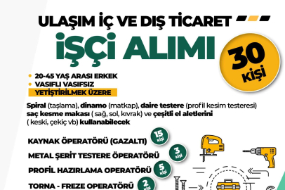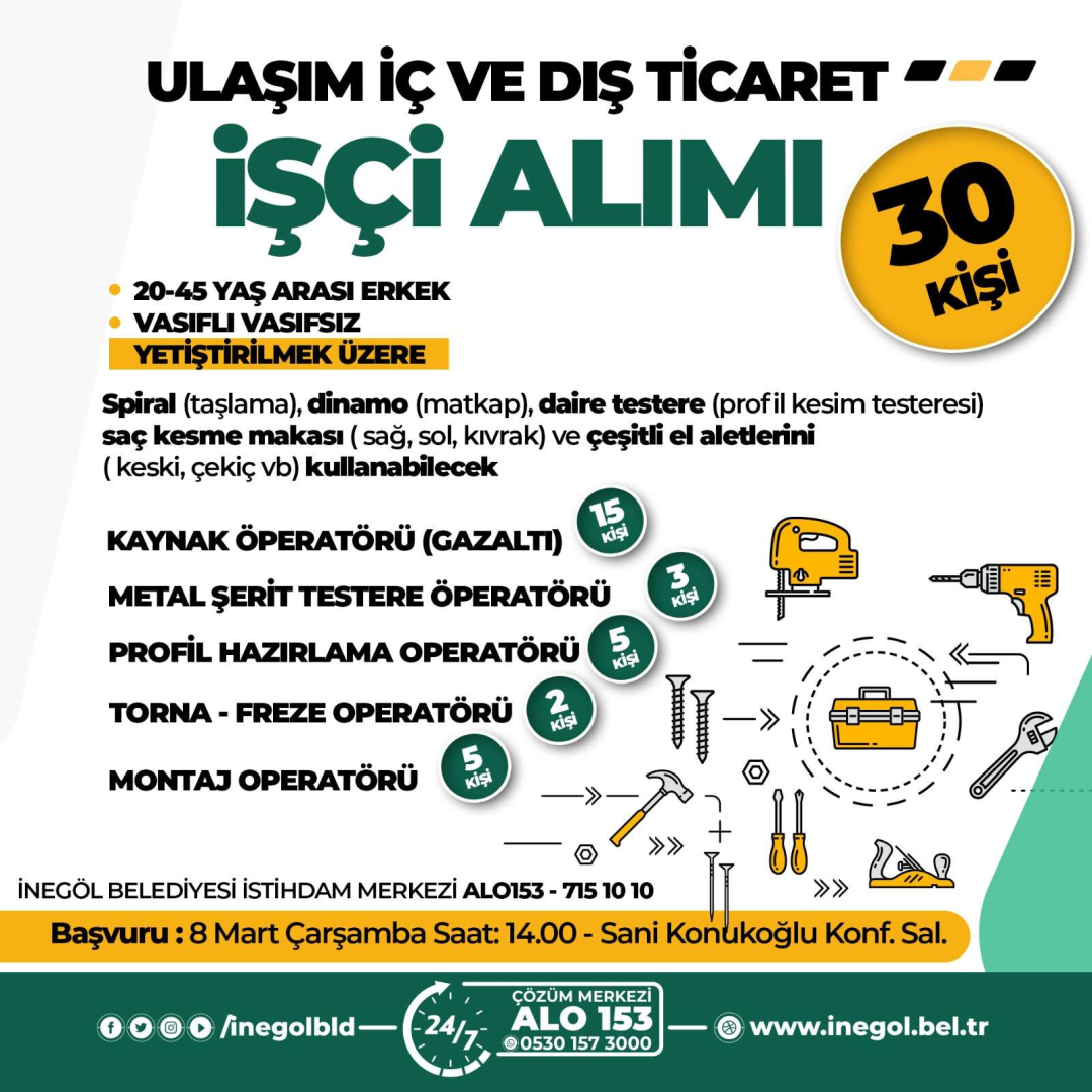 İnegöl Belediyesi İstihdam Merkezinden yapılan açıklamada, Hamzabey OSB’de üretimini sürdüren Ulaşım İç ve Dış Ticaret A.Ş. otomotiv firmasında çalışmak üzere 30 erkek personel alımı yapılacağı duyuruldu. Açıklamada şu ifadelere yer verildi: “İstihdam Merkezimizle iş birliği yapan Ulaşım İç ve Dış Ticaret A.Ş. otomotiv firması; 20-45 yaş arası vasıflı ve vasıfsız yetiştirilmek üzere; spiral (taşlama), dinamo (matkap), daire testere (profil kesim testeresi), saç kesme makası (sağ, sol, kıvrak) ve çeşitli el aletlerini (keski, çekiç vb.) kullanabilecek; 15 gazaltı kaynak operatörü, 3 metal şerit testere operatörü, 4 profil hazırlama operatörü, 2 torna-freze operatörü, 5 montaj operatörü olmak üzere toplam 30 erkek personel alımı yapacağını duyurdu. İlgili alım için başvurmak isteyenlerin 08 Mart 2022 Çarşamba günü 14.00’da Sani Konukoğlu Konferans Salonunda yapılacak başvuru kabullerine katılması gerekmektedir. Yapılacak alımla ilgili detaylı bilgi almak isteyen vatandaşlar 153 hatları üzerinden ve 0 224 715 10 10 Nolu telefondan İnegöl Belediyesi İstihdam Merkezine ulaşabilirler.”