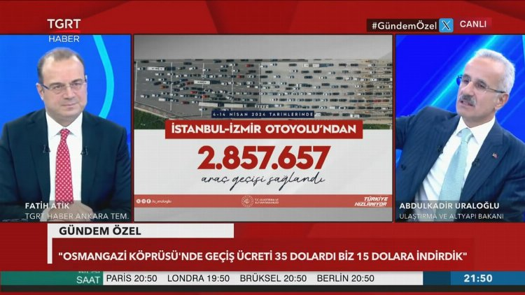 TGRT Haber’de gündem özel programına konuk olan Bakan Uraloğlu, Osmangazi Köprüsü’nün ve İstanbul İzmir Otobanı’nın trafiğe çok önemli katkılar sunduğunu daha önceleri 8,5 saat süren yolculuğun 3,5 saate düştüğünü kaydetti. Osmangazi Köprüsü’nün günlük geçiş garantisinin 40 bin araç olduğunu, bugün ortalama 60 bin aracın köprüyü kullandığını hatırlatan Bakan Uraloğlu, otobanda da 4-14 Nisan bayram tatili süresince 2 milyon 857 bin 657 aracın geçtiğini ve rekor kırıldığını hatırlattı.