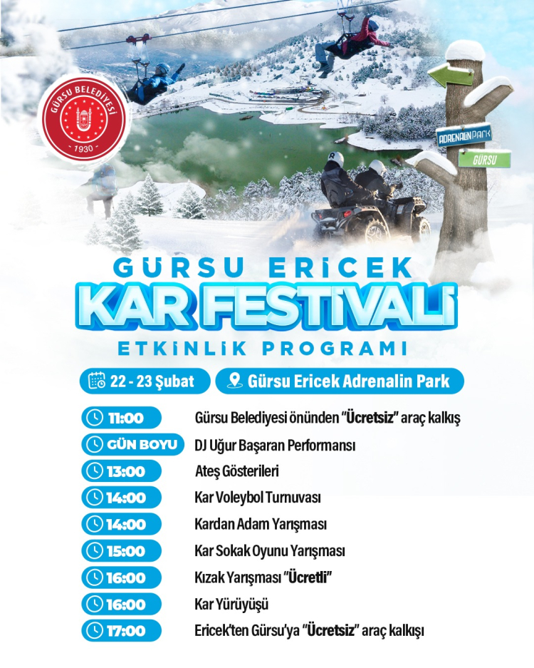 Gürsu Belediyesi Katırlı Dağı eteklerinde konuşlandırdığı Ericek Adrenalin Park’ta hafta sonu renkli bir festivale hazırlık yapıyor. İlk kar yağışında büyük bir kalabalığın akınına uğrayan Ericek Adrenalin Park, bu hafta sonu misafirlerini farklı etkinliklerle ağırlayacak.