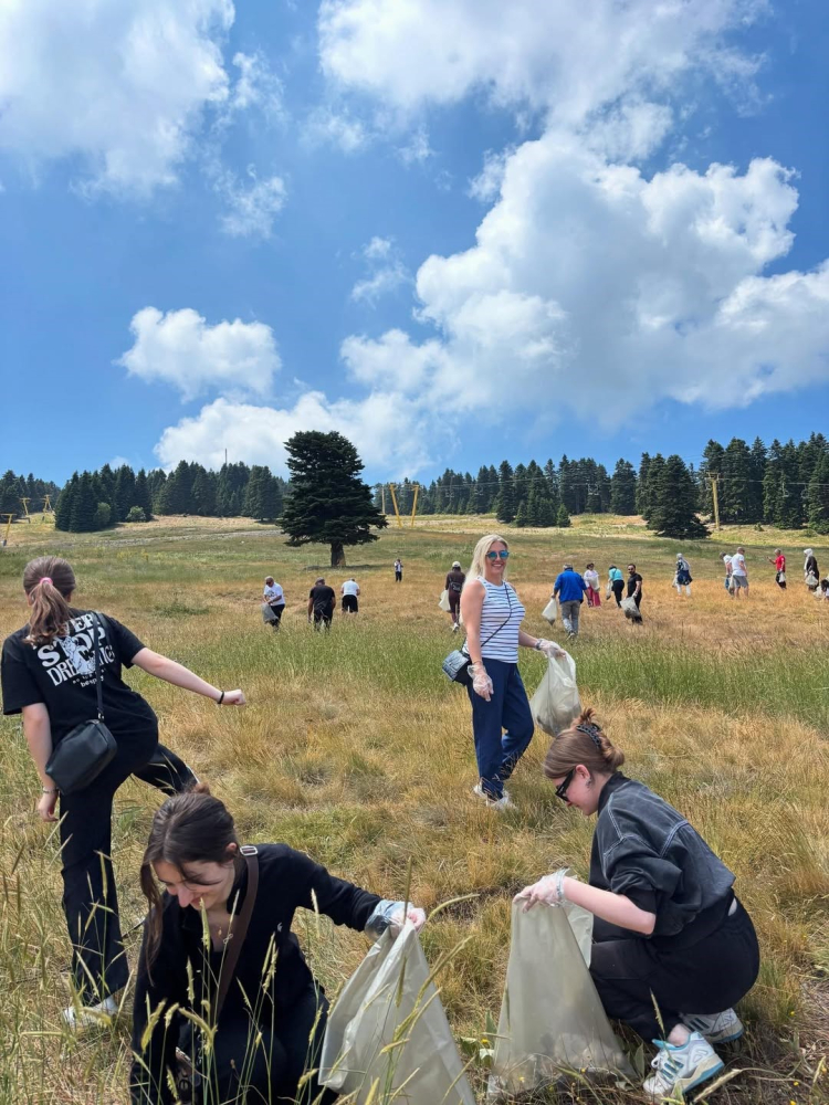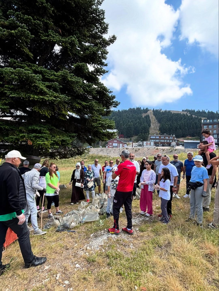 Uludağ'da kayak öğretmenleri ve aileleri 30 çöp poşeti ve 2 konteyner atık topladı. Orman yangını riskine karşı Uludağ'da girişler 8 Temmuz-15 Ekim 2025 arası yasak. Etkinlikte cam ve plastik atıklar temizlendi, ateş yakmanın yasak olduğu hatırlatıldı.