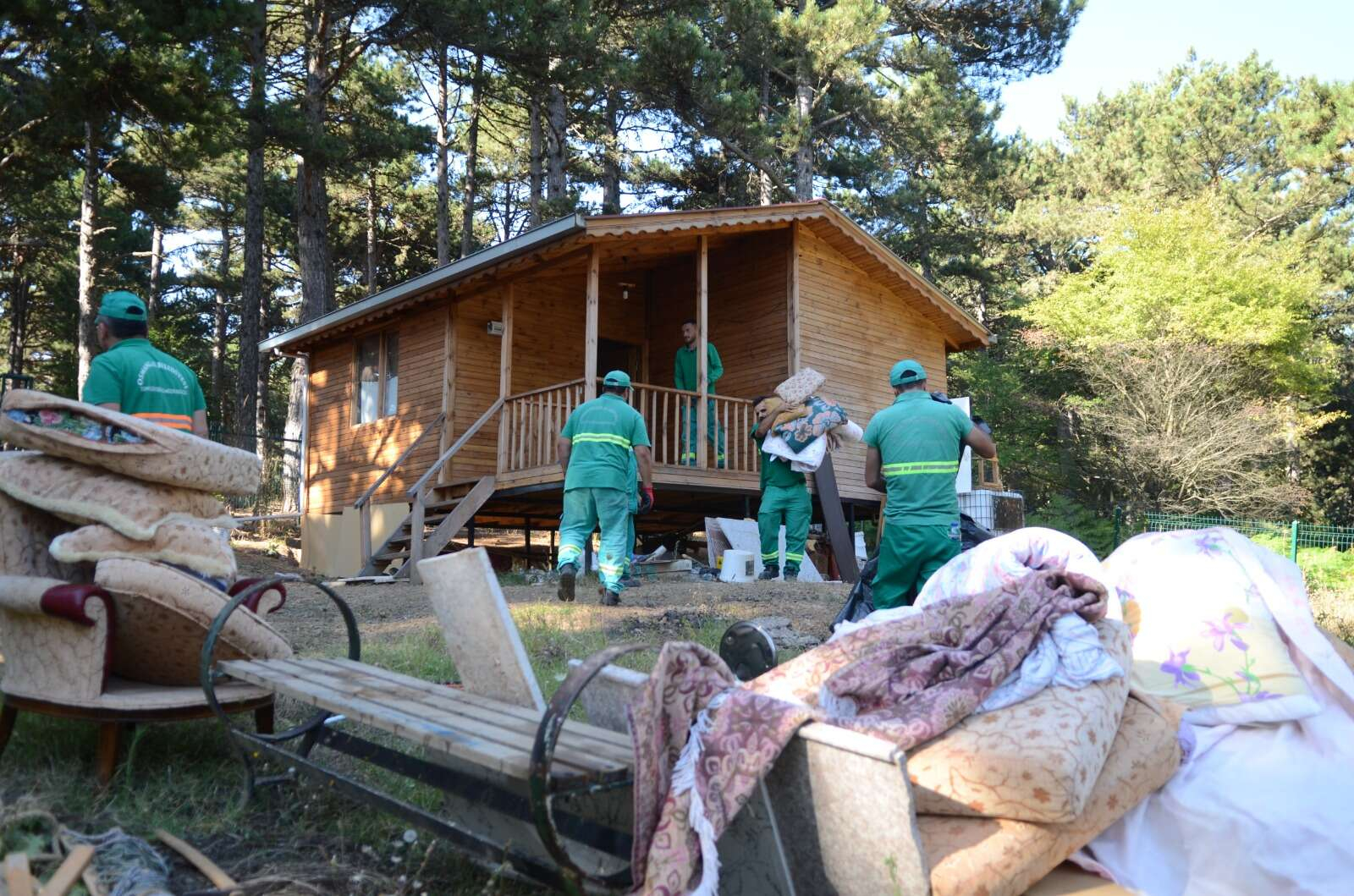 Doğal sit alanı üzerine çam ağaçlarının gizleyeceği şekilde inşa edilen ahşap evin yıkımı için bölgeye giden Yapı Kontrol Müdürlüğü ekipleri, yapının içerisindeki eşyaların arazide müsait bir yere taşınmasını sağladı. İçerisi boşaltılan ev daha sonra iş makinesi ile yıkılarak kullanılamaz hale getirildi.