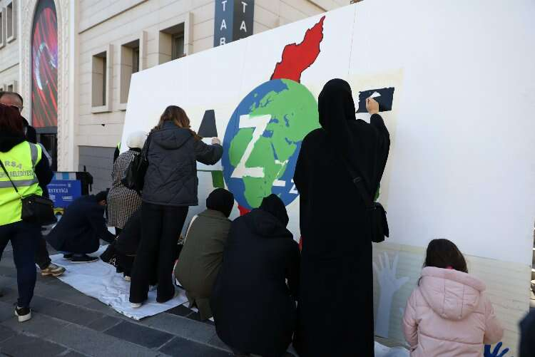 Sivil katliamının durdurulması yönünde dünyadan yükselen çağrılara kulak tıkayan katil İsrail, 7 Ekim’den bu yana Amerika ve Avrupa’nın da desteğini alarak hastane, okul, cami, kilise ayrımı yapmadan Gazze’yi bombalamaya devam ediyor. Bebek, çocuk, kadın demeden dünyanın gözü önünde tarihin en büyük katliamlarından birini yapan İsrail, 20 binin üzerinde insanı şehit ederken, 55 bine yakın insanın da yaralanmasına sebep oldu. Dünya genelinde tepkiler çığ gibi büyürken, Bursa Büyükşehir Belediyesi’nin düzenlediği etkinlikte biraraya gelen Bursalılar barış mesajları verdi. Büyükşehir Belediyesi Kent Estetiği Şube Müdürlüğü ressamları, dev bir pano üzerinde ‘Gazze, dünya ve insanları temsil eden eller’ silueti çalıştı.