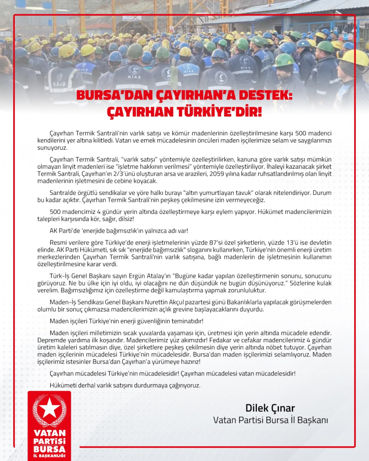 Vatan Partisi Bursa İl Başkanı Dilek Çınar, Çayırhan Termik Santrali'nin özelleştirilmesine ve kömür madenlerinin satışına karşı çıktı. Maden işçilerinin direnişi destekleniyor. Çınar, hükümeti varlık satışını durdurmaya çağırdı.