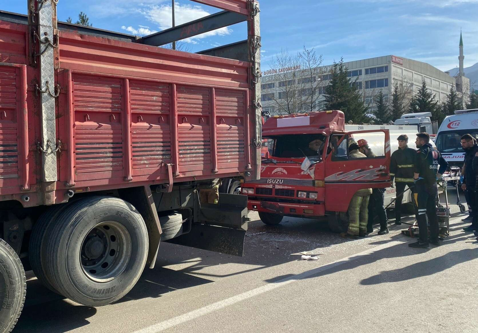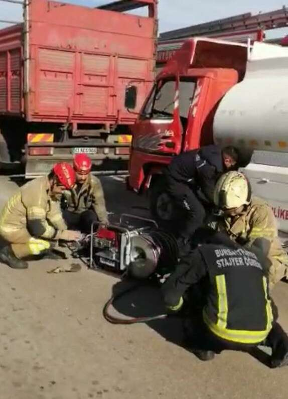 Bursa'da yakıt tankeri ile kamyonun çarpıştığı kazada sürücü araç içinde sıkıştı. Kurtarma ekipleri zamanla yarışırken, itfaiye muhtemel bir sızıntıya karşı tedbir aldı.