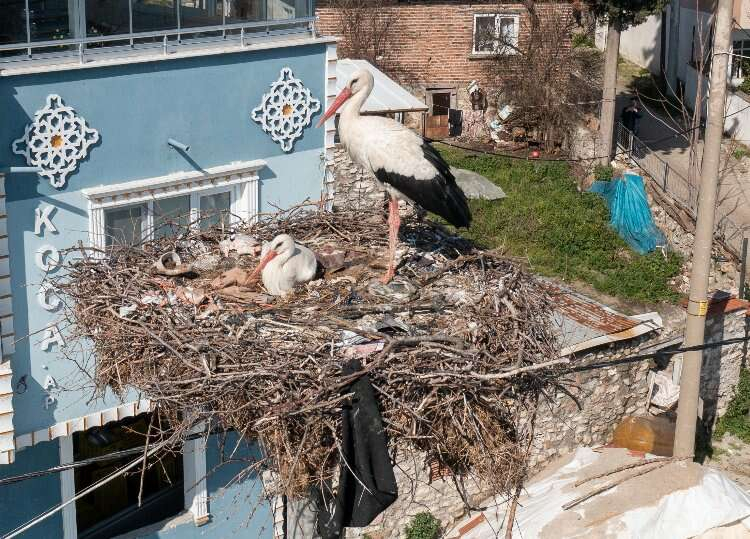 Son 13 yıldır çıktığı her göç yolculuğunda Bursa'daki kayıkçı dostu Adem amcayı unutmayan Yaren leylek bu yıl eşi Nazlı ile birlikte geldiği Eski Karaağaç köyündeki yuvasında güneşli havanın tadını çıkarıyor.