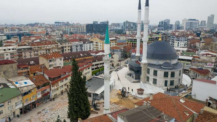 Bursa'da FETÖ'nün yıkılan okulunun yerine yapılan yeni cami inşaatı tamamlandı. Yeni cami tamamlanınca eski caminin minaresi kontrollü olarak yıkıldı. O anlar dron ile havadan görüntülendi.