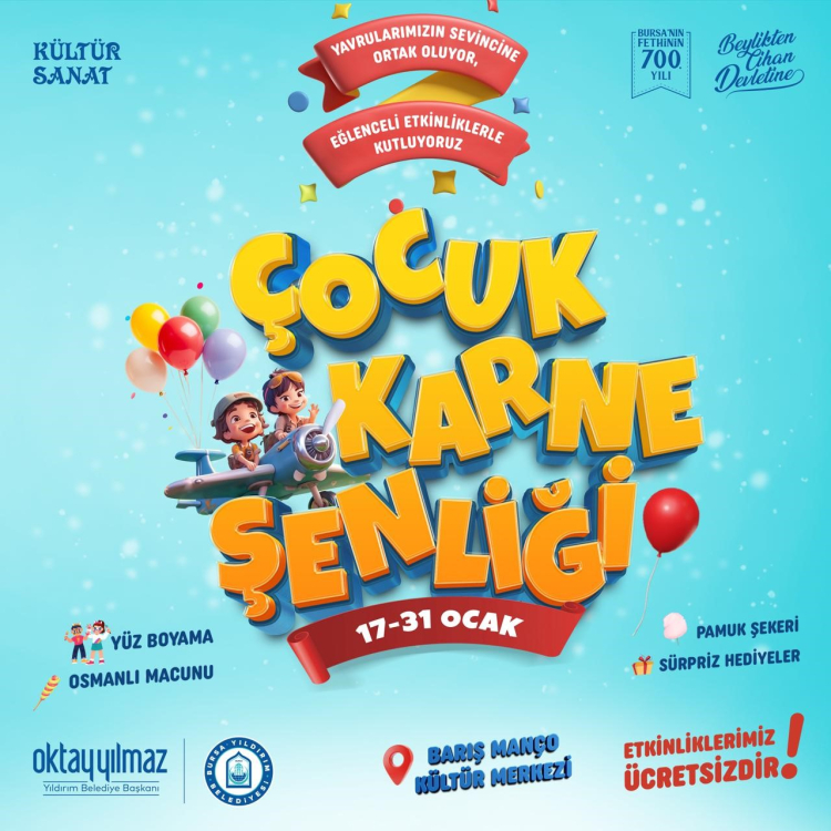 Yıldırım Belediyesi Kültür Sanat ve Sosyal İşler Müdürlüğü tarafından düzenlenen Karne Şenliği, 17-31 Ocak tarihleri arasında Barış Manço Kültür Merkezi'nde gerçekleştirilecek. Şenlik kapsamında çocuklar için birbirinden eğlenceli etkinlikler ücretsiz olarak sunulacak.