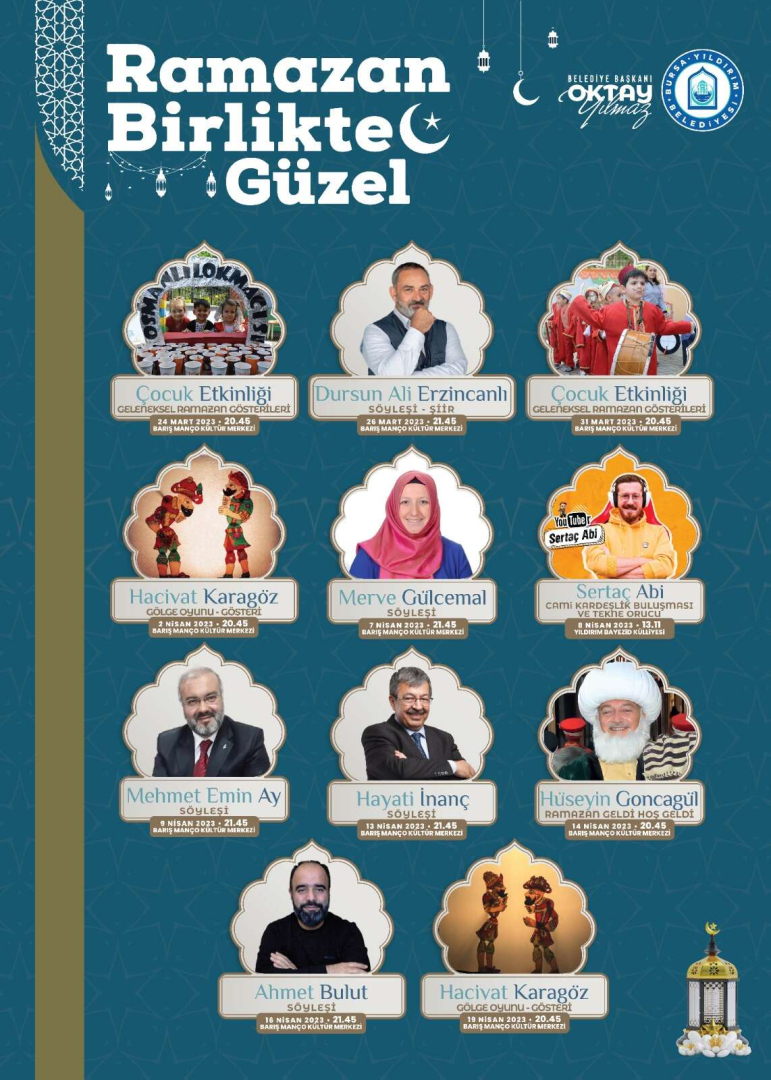 Yıldırım Belediyesi, af ve mağfiret ayı Ramazan Şerif’i bu yıl da çeşitli etkinliklerle idrak edecek. Ramazan ayı boyunca etkinlikler hem Yıldırım’da hem de kardeş şehir Malatya Yeşilyurt’ta gerçekleşecek. ‘Ramazan Birlikte Güzel’ sloganıyla önemli konukları vatandaşla buluşturacak olan Yıldırım Belediyesi, Barış Manço Kültür Merkezi’nde Dursun Ali Erzincanlı, Merve Gülcemal, Sertaç Abi, Mehmet Emin Ay, Hayati İnanç, Ahmet Bulut, Hüseyin Goncagül’ü misafir edecek ve birbirinden güzel geleneksel ramazan etkinlikleri ile minikleri eğlendirecek. Yine Ramazan ayı boyunca İlahiyatçı-Yazar Erkan Aydın ile Bursa’da İftar programı canlı yayın ile Ülke TV’de izleyiciyle buluşacak. Ayrıca konteyner kent çalışmaları devam eden Yeşilyurt’ta çalışmalarını sürdüren Yıldırım Belediyesi, bölgede kurduğu etkinlik çadırında Nurullah Genç, Abdullah Yıldız, Ali Nuri Türkoğlu, Hasan Dursun, Bahadır Yenişehirlioğlu, Beytullah Özdemir, İsmail Hakkı Ürün, Murat Belet, Hüseyin Goncagül ve ekibi, Hacivat Karagöz ile Yarışma, Ramazan Dede, Kuran’ı Kerim Tilaveti programları ile vatandaşlara ve çocuklara özel pek çok program düzenleyecek.